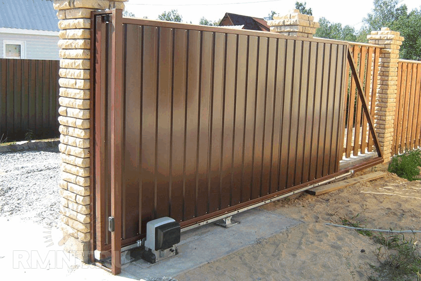 Данные конструкции отличает простота и надёжность. Полотно ворот ставят на ролики. На поверхности крепят специальный рельс, по которому оно будет ездить. Для устойчивости предусматривают дополнительную поддержку.