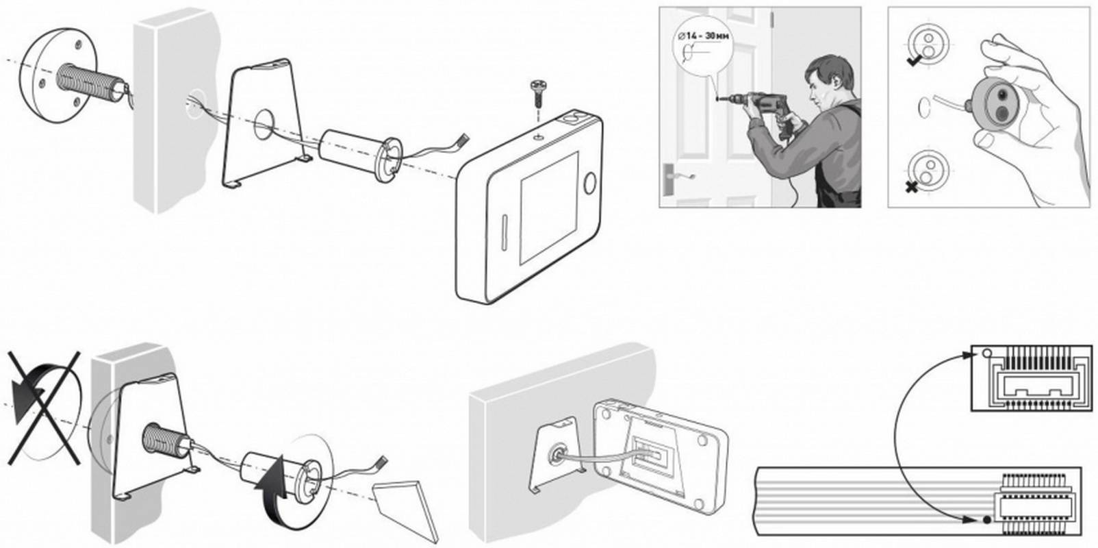 В первом случае всю работу выполняет сам хозяин квартиры. Достаточно просверлить в двери сквозное отверстие под камеру и, выполняя инструкцию, установить на двери камеру, дисплей и соединить их разъёмом.