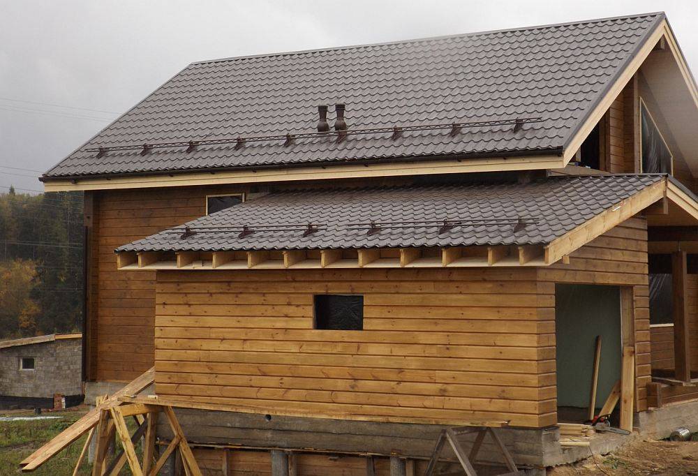 Подходящие для постройки крыши пристройки дома доски – 100*25 мм. К наружной стене упирается мауэрлат, а к нему закрепляют стропила. После чего обустраивают гидроизоляцию и монтируют на нее обрешетку. В процессе укладки стропил требуется состыковать крышу дома со строящимся гаражом. Это осуществляется путем крепления стропил пристройки к стропилам существующего здания.
