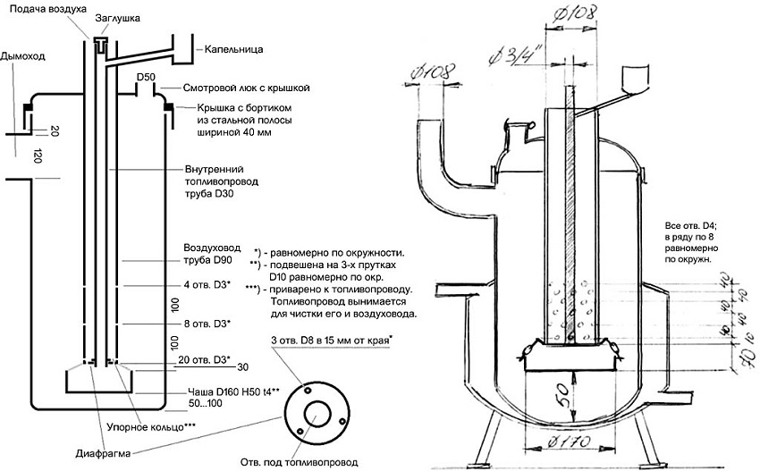 Печь на отработанном масле считается наиболее экономной, так как исключает дополнительные затраты на топливо. Если правильно рассчитать материалы и четко следовать инструкции по изготовлению, то она не будет дымить и чрезмерно загрязнять воздух. Предусмотрена работа таких печей на трансмиссионном, машинном или трансформаторном масле. По такому же принципу функционирует дизельная печь для гаража.