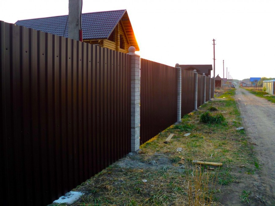 - При строительстве забора из кирпича, с профнастилом изготавливают комбинированный фундамент, который устанавливают ниже уровня промерзания грунта. Он обеспечивает надёжность ограждения, его прочность и большой срок эксплуатации такого ограждения.