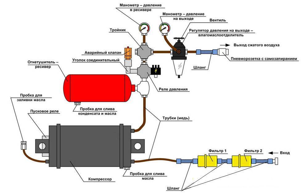 Холодильный мотор снабжен тремя выходами. Требуется пометить для себя входное и выходное отверстие. Запаянный выход применяется для замены масла в двигателе. Его необходимо срезать, слить масло, залить новое (синтетику или полу-синтетику) и запаять. С баллона требуется демонтировать выпускной клапан, снять крышку. Баллон очищают от следов коррозии и загрязнений снаружи и внутри, монтируют на место крышку. В крышку помещают переходник и крестовину. Верхний патрубок предназначен для манометра и тройника. Еще один патрубок применяют для установки предохранительного клапана. Затем следует изготовить раму для устройства. На раму-основу закрепляют мотор и баллон-ресивер. К вводной трубке следует присоединить топливные фильтры. Проводку мастерят при использовании реле давления, тумблера и реле пуска