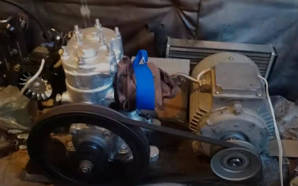 По правому краю станины устанавливают электродвигатель, крепят жестко на болты. Слева от него размещают компрессор. Шкив, взятый от автомобильного генератора, приваривают на втулку.