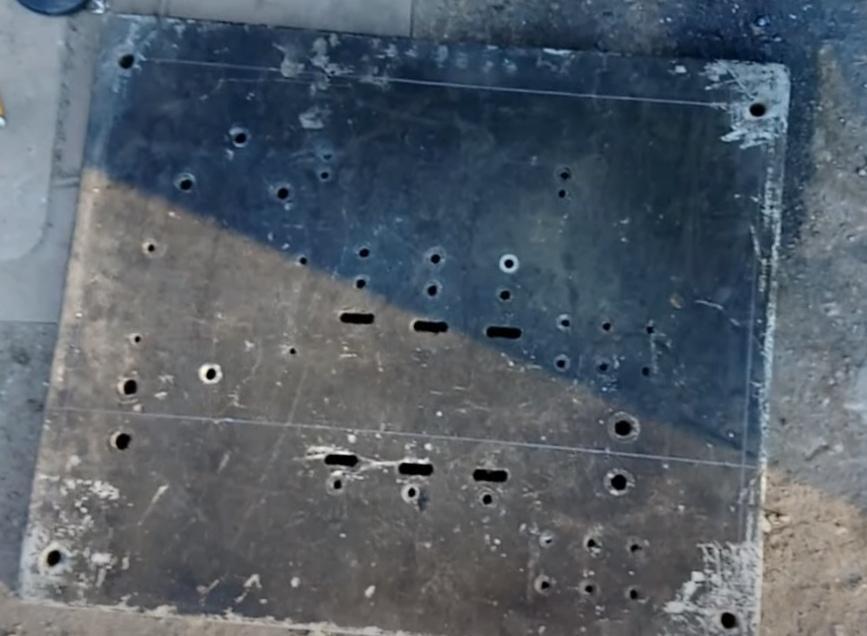 На листе гетинакса начертить прямоугольник нужного размера (50×30 см). Потом, прикладывая колесо, в каждом углу наметить точки крепления. Болгаркой вырезать заготовку станины. Дрелью просверлить отверстия и прикрутить на болты колеса.