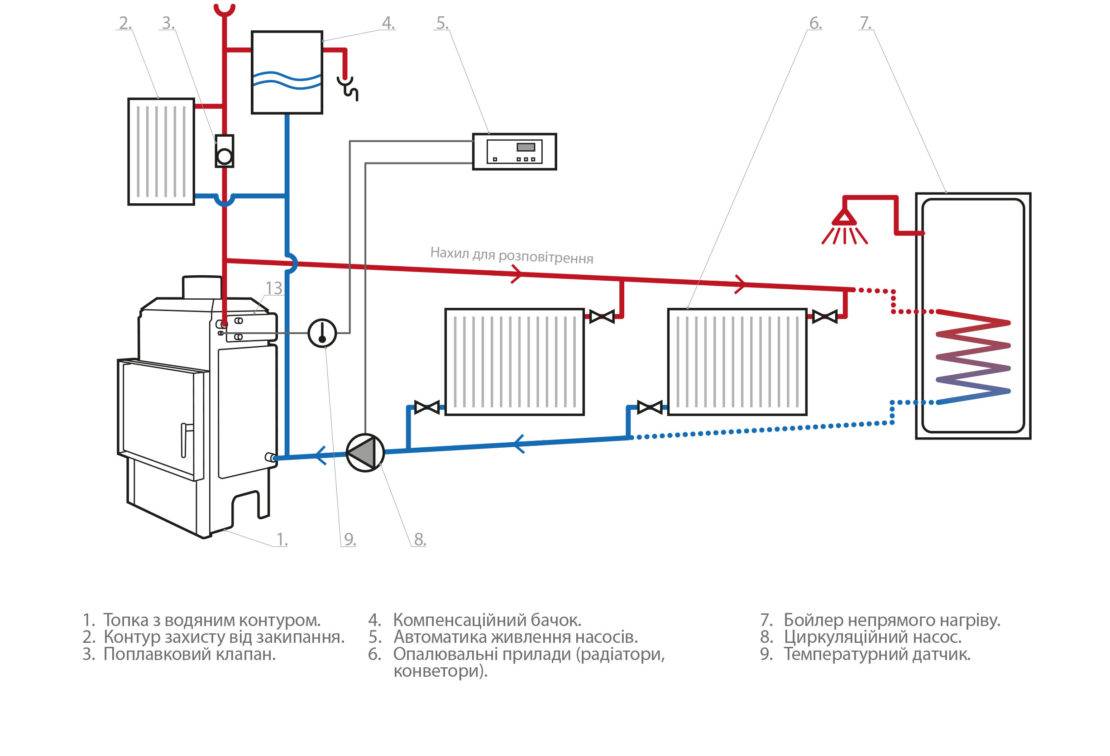 Одноконтурная система будет работать без дополнительного насоса, за счет тепловой конвекции. Более сложная схема потребует циркуляционного насоса. Расширительный бачок не даст попасть воздуху в систему при падении уровня жидкости по причине естественного испарения.