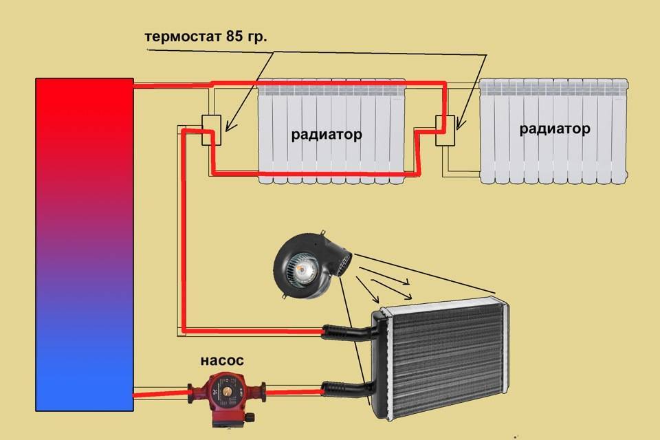 Ещё один вариант с элементами воздушного отопления. Для этого придётся использовать буржуйку с водяным контуром. Только вместо полноценной отопительной системы используется обычный радиатор от автомобиля вместе с вентилятором. Радиатор подвешивается на стену так, чтобы за ним поместился вентилятор. Последний подключается к питающей сети через понижающий трансформатор. Радиатор соединяется со змеевиком шлангами или пластиковыми трубами. Соединение должно производиться так: верхние патрубки змеевика и радиатора соединяются одним шлангом – это контур подачи теплоносителя, нижние между собой образуют контур обратки. Эффективность этого способа отопления гаража заключается в том, что для сборки необходим котёл небольших размеров, который быстро может нагревать теплоноситель. Вентилятор эффективно отбирает тепло, понижая температуру воды по максимуму. То есть, кольцевая система работает по всем теплотехническим законам. Кстати, можно буржуйку заменить кипятильником.