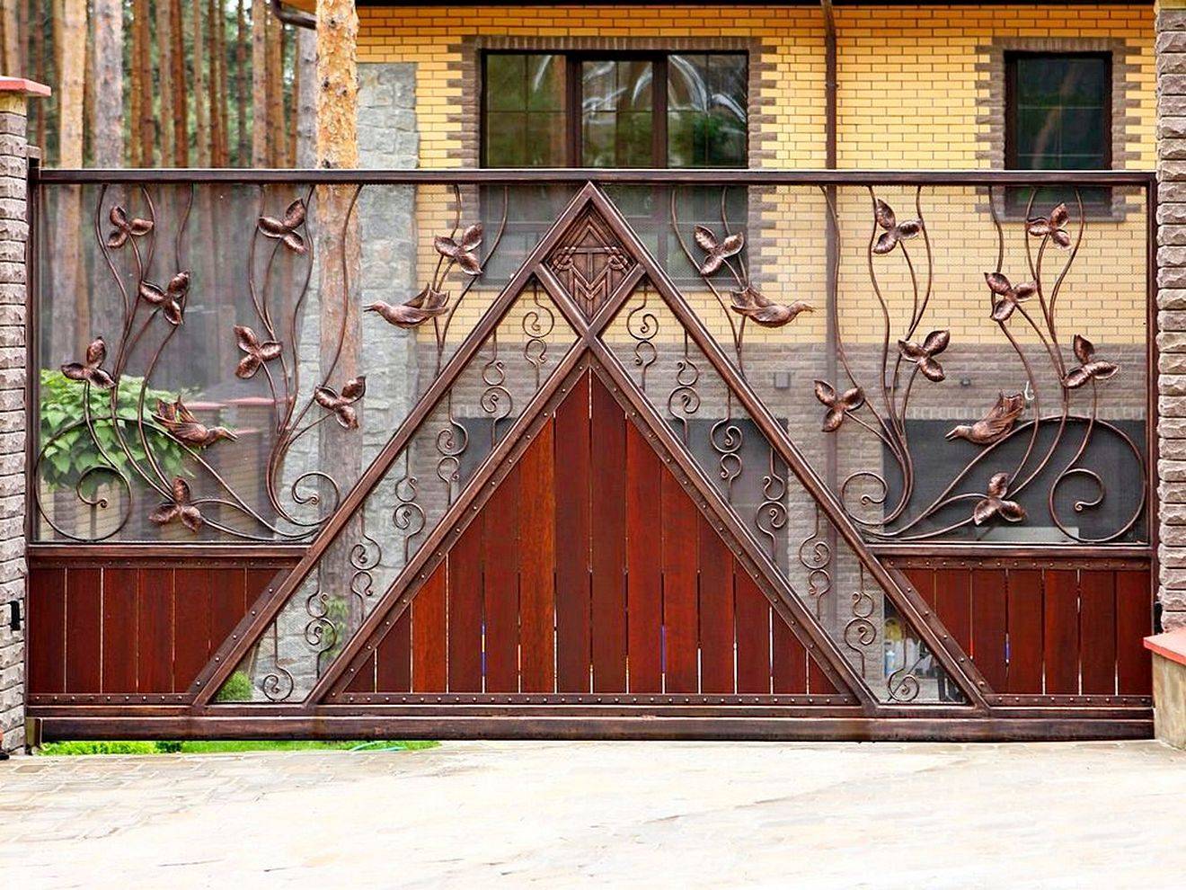 Ворота из профлиста с элементами ковки являются бюджетным вариантом входных групп участка. После обшивки каркаса профлистом конструкция получат необходимую прочность, кованые элементы помимо украшения ворот являются дополнительными ребрами жесткости. Это позволяет снизить бюджет строительства за счет использования проката меньшего сечения. Однако, в массивных крупноформатных конструкциях не следует применять слишком тонкий пруток. Это снизит эстетику восприятия конструкции. Специалисты рекомендуют использовать пруток минимального диаметра 14 мм или сечения 14 х 14 мм (круг, квадрат, соответственно).