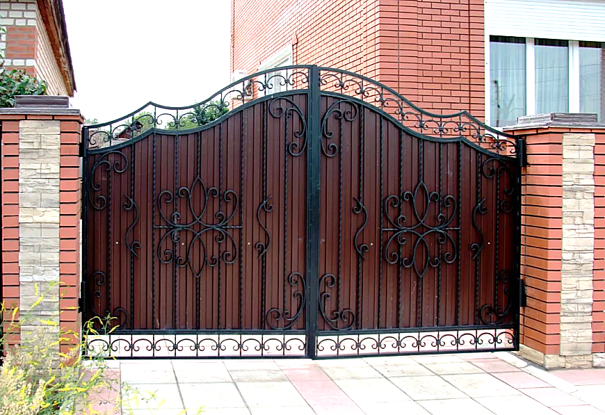 Металлические – такой тип полностью изготавливается из декоративных элементов, железных прутьев, уголков. Очень стильно и красиво выглядит, однако обойдется очень дорого. Комбинированные – конструкции из различных материалов, украшенные металлическими коваными элементами. Стоят в несколько раз дешевле. Сочетание материалов зависит от вашей фантазии и потребностей, но самым популярным вариантом считаются ворота из профнастила с элементами ковки.