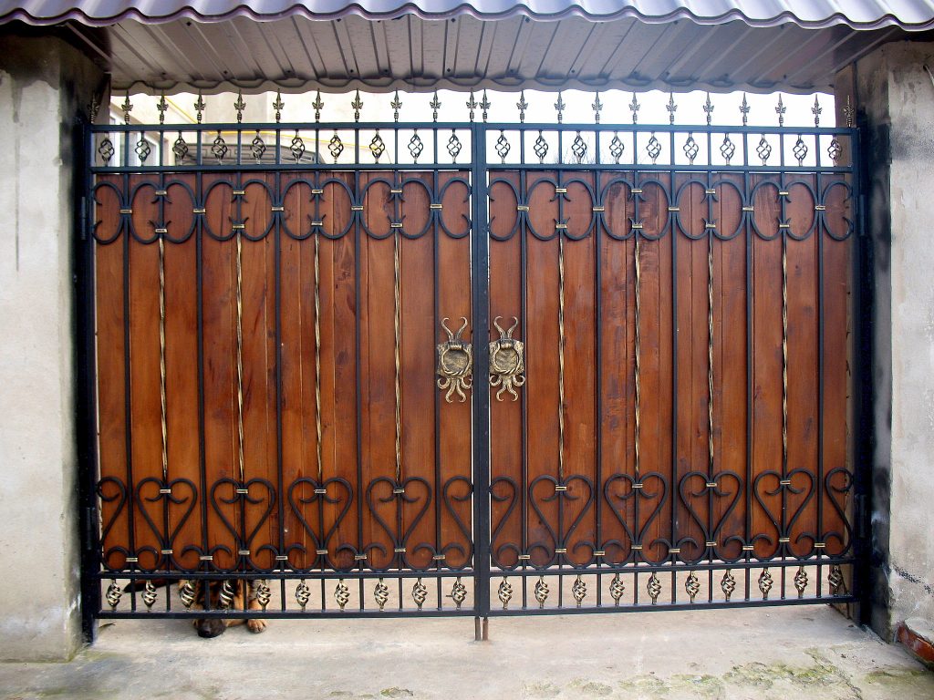 Ручками. Такие элементы подойдут под классические мотивы. К преимуществам кованых ручек относятся: прочность, надежность, долговечность, практичность и функциональность. По разновидностям они делятся: на стационарные (надежно закрепленные на дверном полотне для обеспечения удобства при открывании и закрывании), нажимные (оснащаются защелкой или замком, что позволяет закрыть ворота или калитку на замок). По формам декоративные ручки бывают: прямыми и строгими, декоративными с изогнутыми завитками.