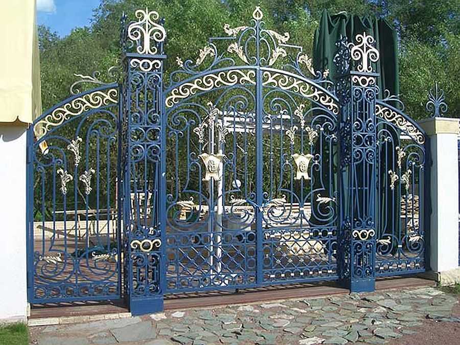 Парадный вход в прямом смысле этого слова обеспечат кованые ворота в стиле барокко или ренессанс. Они придадут торжественности любой усадьбе. Чаще всего такие кованные элементы декора, как беседки, качели, лавочки, и, конечно, ворота, выполняются в большим количеством дополнительных элементов, чаще всего спиралей и завитков.