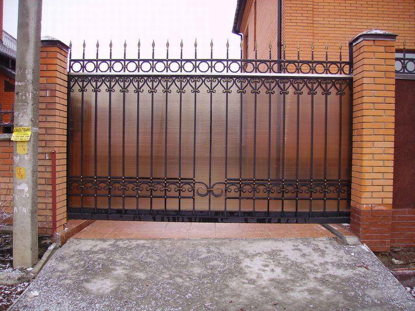 Стоимость кованого забора, обшитого поликарбонатными листами, является довольно демократичной. Специалисты рекомендуют использовать такое сочетание в том случае, если участок расположен в черте города. Использование поликарбоната не перегружает конструкцию, поэтому готовая ограда смотрится лаконично.
