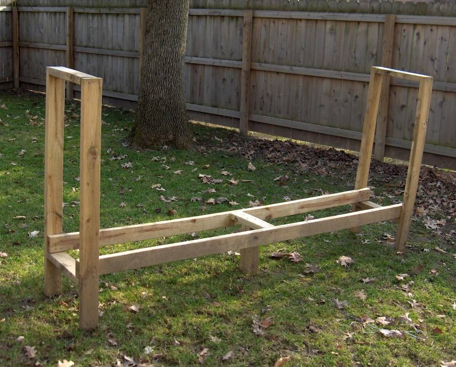 Осталось только определиться с линейными размерами конструкции. А основной размер — это высота ножек. Опытным путем было установлено, что оптимальной высотой собранной конструкции станет рост мастера, который буде выполнять работы, минус 10-12 см. Количество распорок для жесткости тоже может быть произвольным, как и сечение бруса, из которого будет выполнена рама.