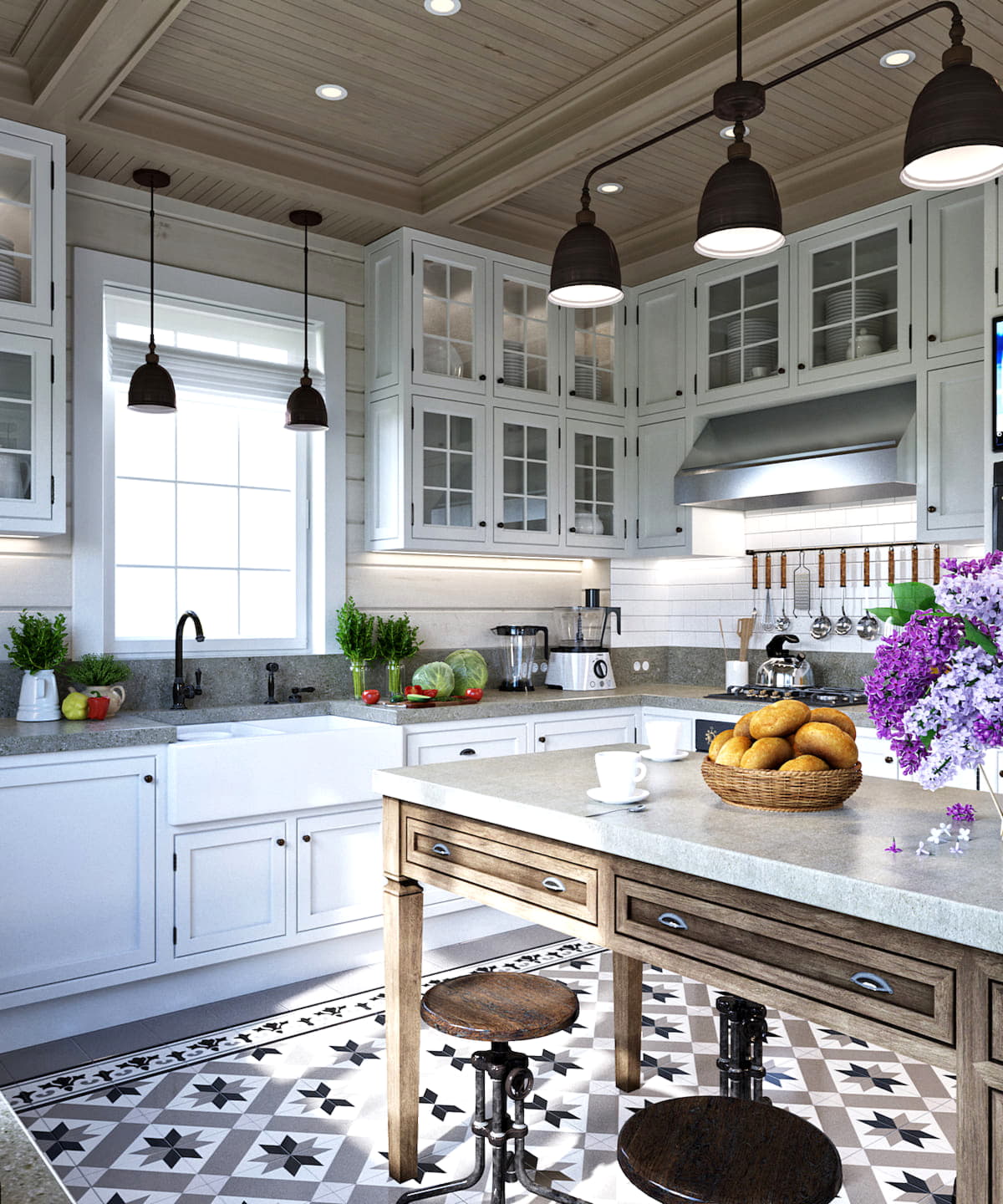 В этом стиле отражается всё очарование средиземноморского побережья. Подобный интерьер хорошо смотрится и в небольших, и в просторных кухнях. Такое оформление придётся по вкусу хозяйкам, которые любят готовить и проводят много времени на кухне. Можно охарактеризовать этот стиль как женский, за его любовь к цветастому принту, обилию декора и мягким краскам. Красивая посуда, кружевные занавески, многочисленные ящички и полочки с приправами – всё это выставляется на всеобщее обозрение.