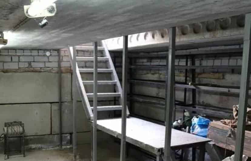 Нужно определиться, где в подвале будет находиться основание спуска. На этом месте вырывают небольшое углубление, глубиною до полуметра. Основание металлической конструкции помещают в подготовленную яму, засыпают щебнем и заливают бетоном.