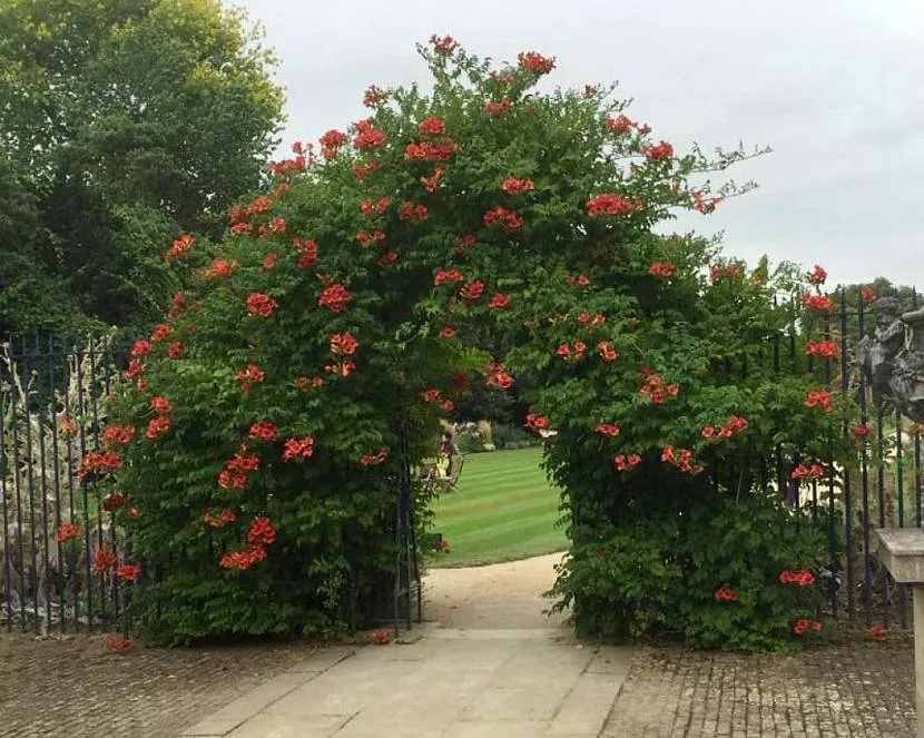 Очень красивое получится у вас ограждение участка с таким декоративным растением. Кампсис любит, свет, тепло и полив. Зато своими потрясающими трубчатыми цветами ярко-оранжевого, красного или малинового цвета он будет радовать с июня по сентябрь.