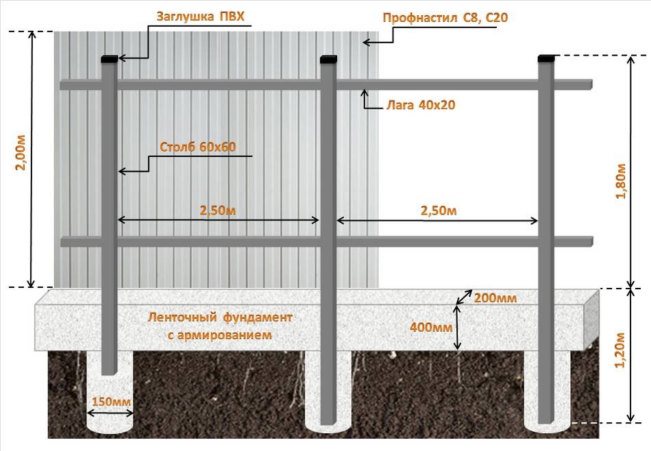 ысоту будущего ограждения плюс 1-1,5 м, которые закапываются в землю.