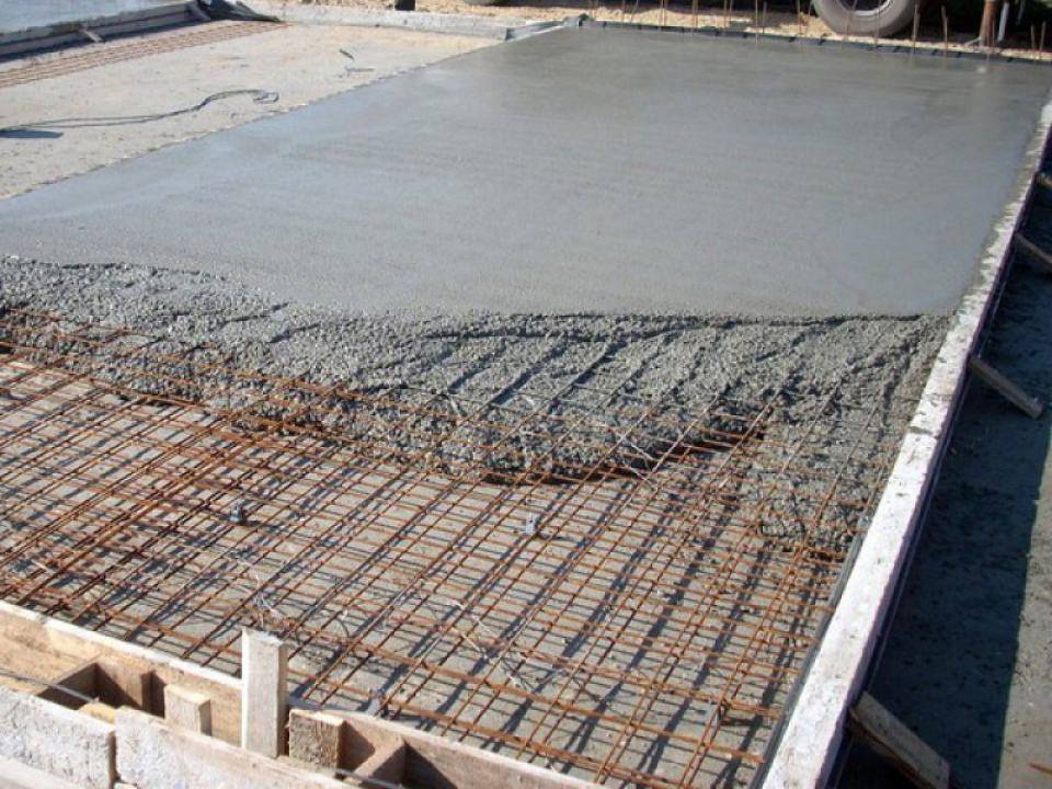 Перед заливкой грунт необходимо утрамбовать, уложить слой песка в 5-8 см, затем слой щебёнки в 10 см и снова это всё утрамбовать. Поверх щебенки укладывается гидроизоляция и металлические прутья, образуя сетку с шириной ячейки в 20 см.