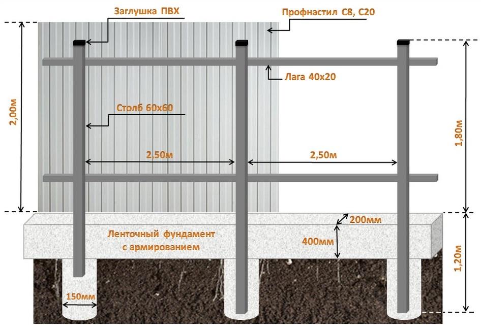 При высоте забора 2 м из стандартных листов высота столбов с учётом глубины заложения составит 3÷3,5 м.