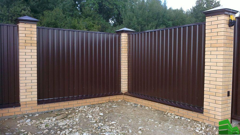 Такое ограждение получило широкое распространение, благодаря своему благородному внешнему виду. Между колоннами из кирпича располагаются секции из профнастила, который крепится на лаги из профильной трубы или уголок. Если пролеты между опорными столбами достаточно большие, появляется необходимость в монтаже дополнительных лаг, которые устанавливаются с тыльной стороны.
