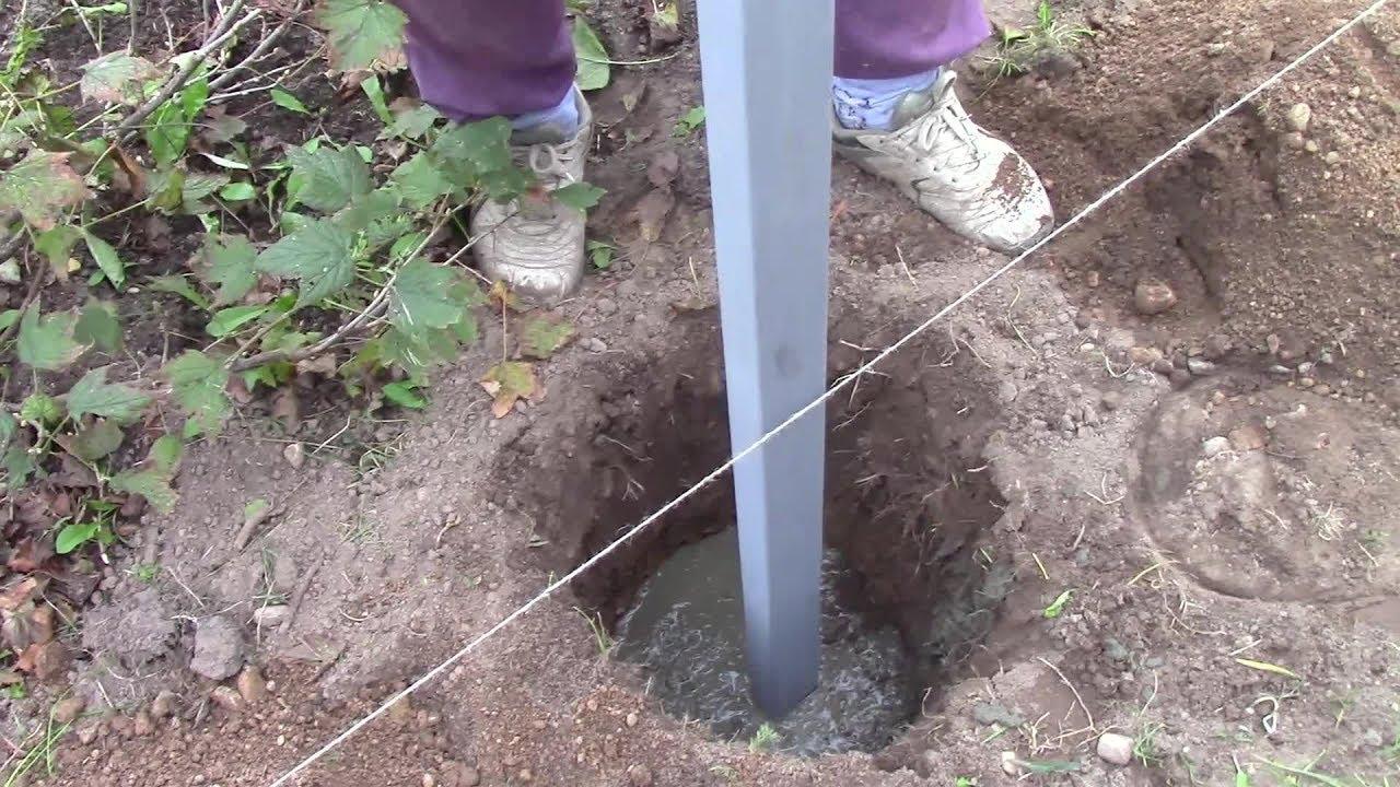 - Через каждые 2,5 м пробуриваются ямы для заглубления столбов. Столбы монтируются и заливаются, как и при устройстве забора без фундамента.