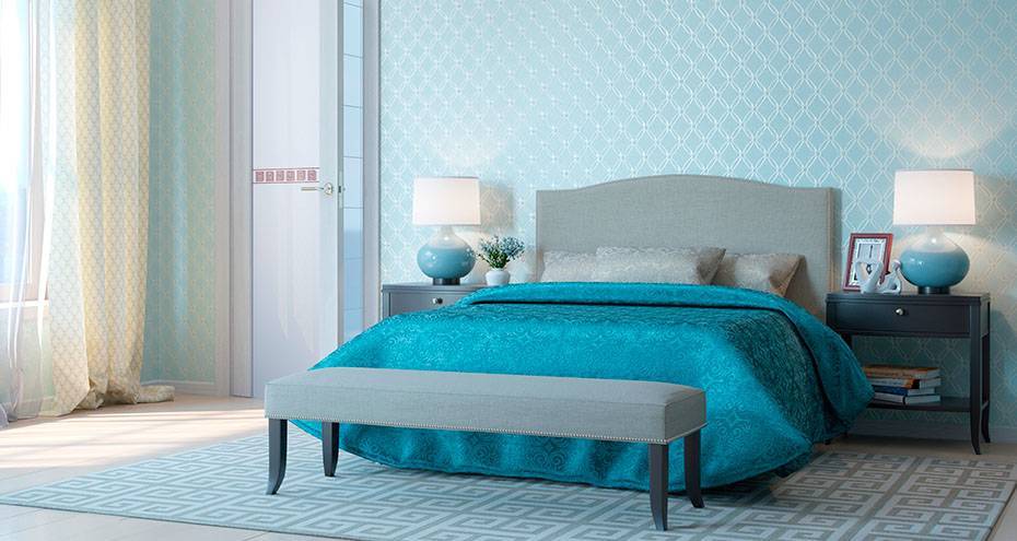 Шпонированные двери в стиле классика великолепно дополнят строгий, но весьма шикарный дизайн комнаты. Благодаря сочетанию синих обоев, белого пола, дверей и оформлению шпоном такого же цвета стен интерьер действительно выглядит великолепно. Стилизованная под старинную банкетка тоже удачно в него вписалась.