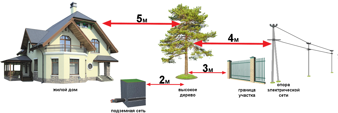 Минимальные расстояния посадки. Деревья можно сажать не менее 5 метров от стены дома.