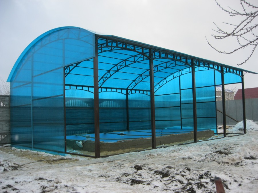 Для кровли всех вышеописанных сооружений: крыльца, балкона, террасы, веранды, бассейна, автомобильной парковки и прочего отлично подойдет сотовый поликарбонат, который позволит сделать навес любой формы и цвета.