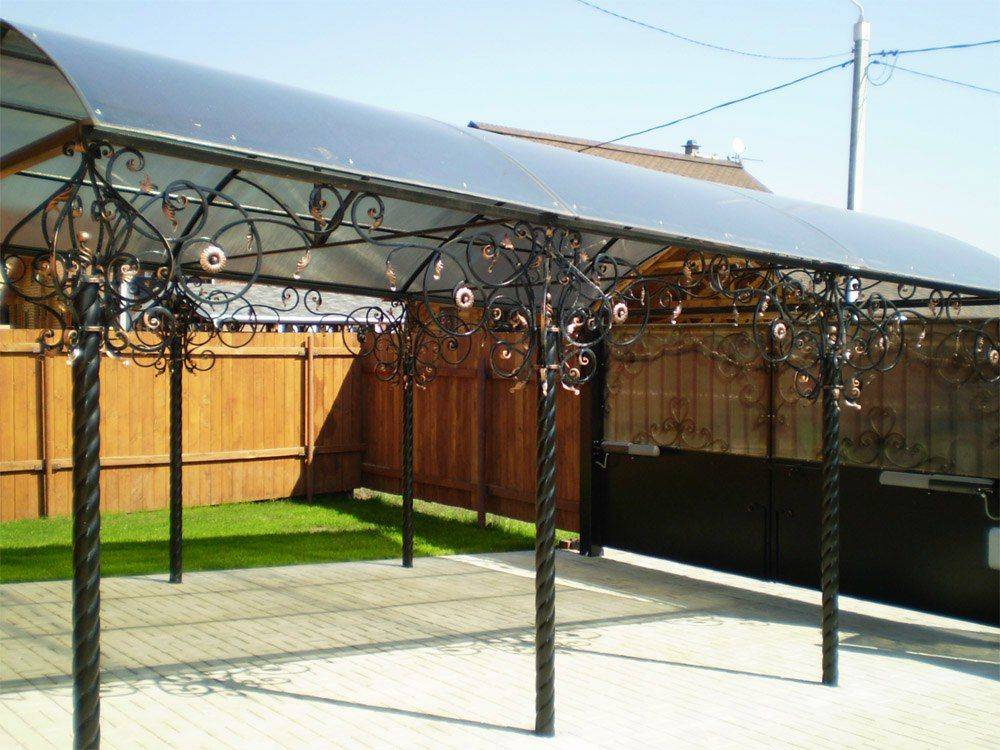 Двухскатный навес из поликарбоната – проект с коваными элементами