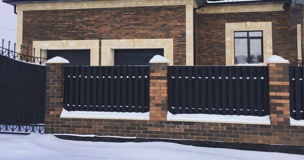 - Ограда из гиперпрессованного кирпича – она экологически чиста и безопасна, выдержит морозы. Есть возможность подобрать под ландшафтный дизайн индивидуальный цветовой оттенок.