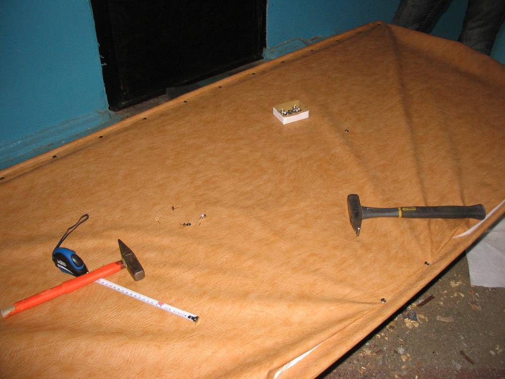 - Натянутый дерматин прибивают по всему периметру, используя декоративные гвоздики.