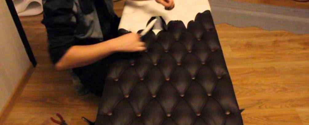 После того как с подготовкой покончено, можно переходить непосредственно к отделочным работам. Первым делом из выкроенных полосок дермантина необходимо сделать валики, которые прибиваются по краям полотна с лицевой стороны. Они могут быть полыми или наполнены ватой.