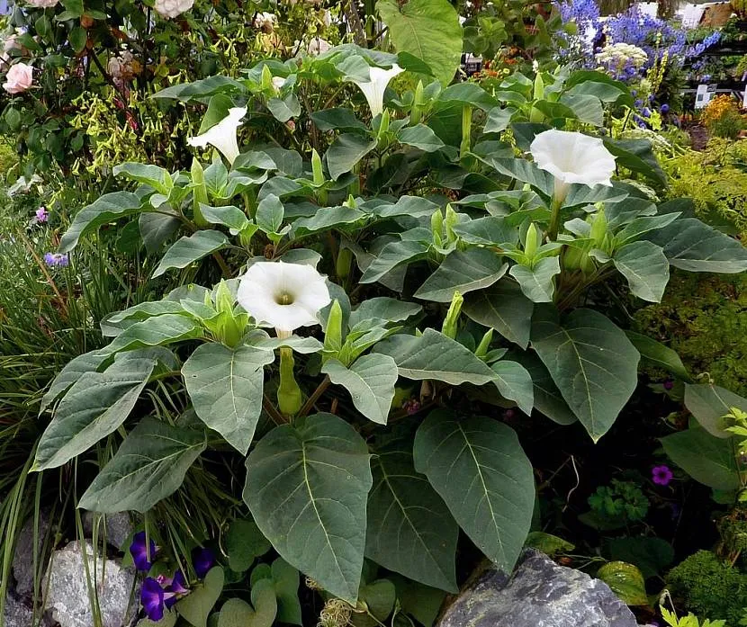 Дурман (датура) – однолетнее растение с красивыми огромными цветками. Высаживают при необходимости декорировать большие площади: он быстро разрастается по земле, при этом достаточно высок.