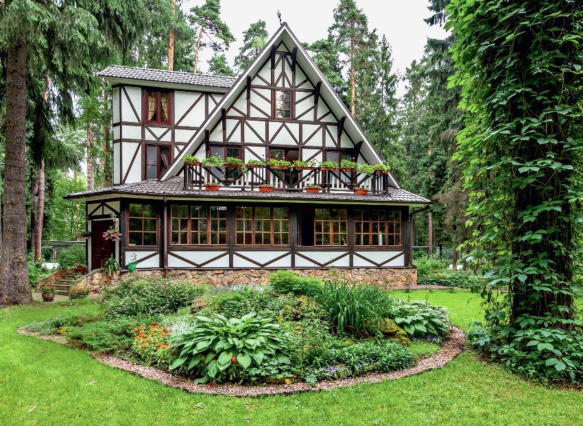 При самостоятельном декорировании зоны возле дома нужно правильно выбрать растительность. Подчеркнуть эстетичный облик деревянного строения, построенного из бревен, помогут высаженные в палисаднике колокольчики или полевые ромашки. Для домика на даче в стиле шале идеальным решением станут туи и ели. Большие постройки в европейском стиле декорируйте палисадниками с газонной травой и небольшими кустарниками.