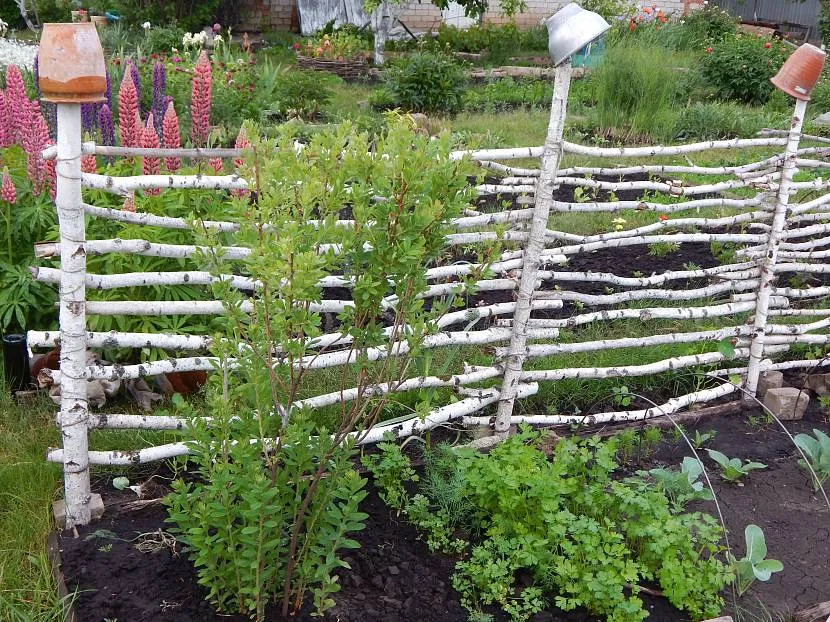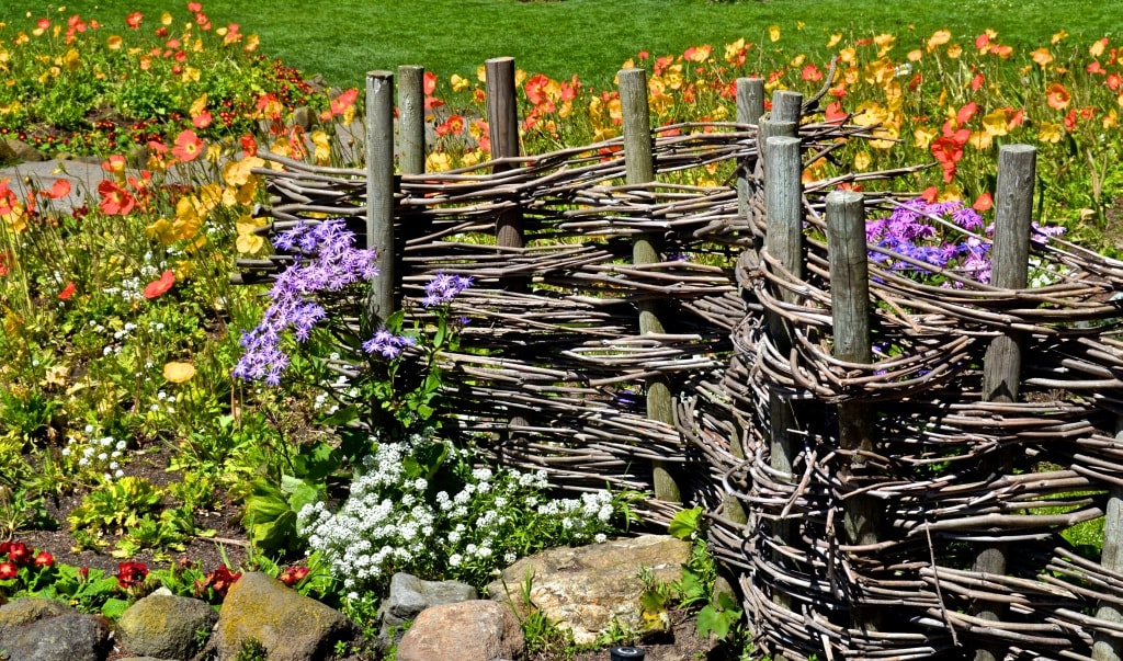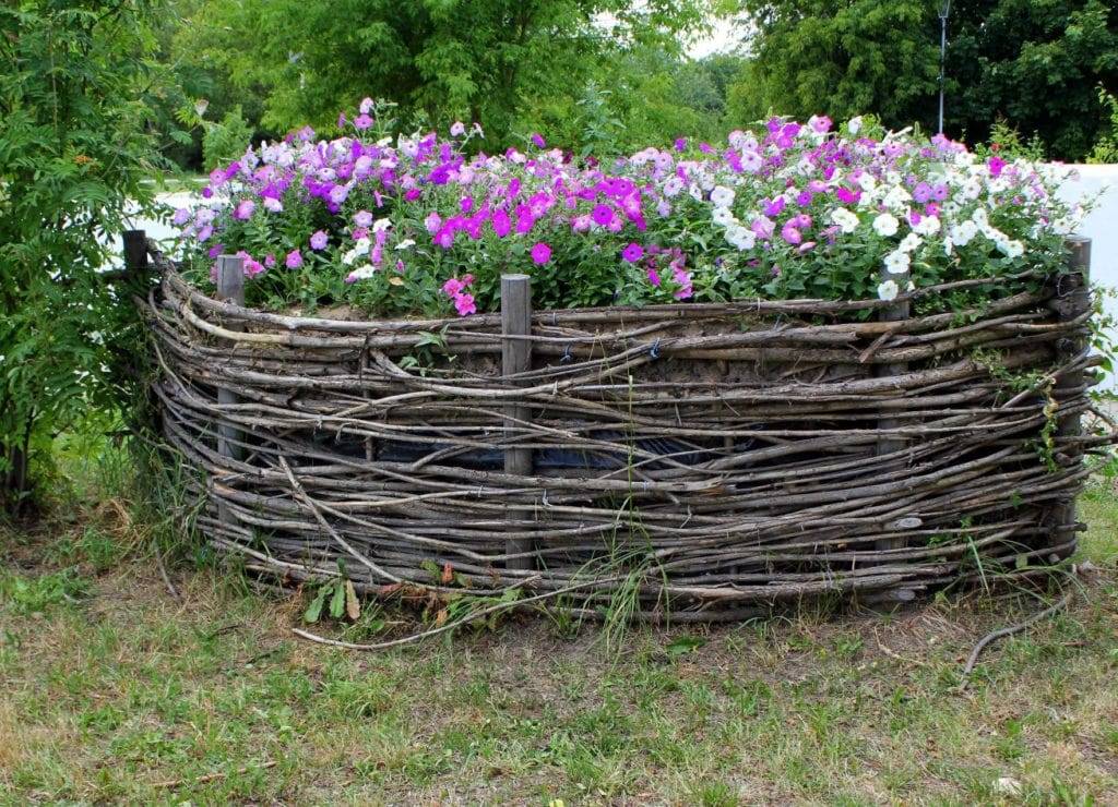 Еще один способ сделать красивое ограждение для клумбы из дерева – использовать ветки или лозу. Чаще всего такие изделия делают из ивы, вербы или березы. Подготовить их лучше в весенний период, но обязательно перед использованием необходимо вымочить в горячей воде. Такие ограждения подчеркивают деревенский стиль и при этом выглядят действительно красиво.