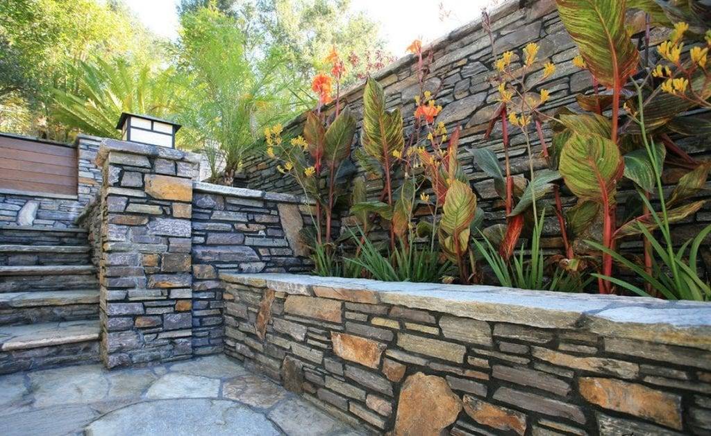 Подпорные стенки, импровизированные скалы, отсыпки или строгие каменные “бусы” можно найти на многих дачах. Они часто используются для создания ограждений. С использованием однообразного материала (плитняка, например) камни обеспечивают красивый законченный вид и хорошо выделяются среди цветов и листвы.
