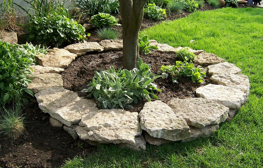 Располагающуюся на газоне клумбу ограждают камнем на песчаной подушке. Устойчивость блоков будет обеспечиваться их весом. В штучные блоки устанавливают металлические штыри.