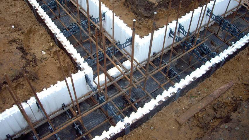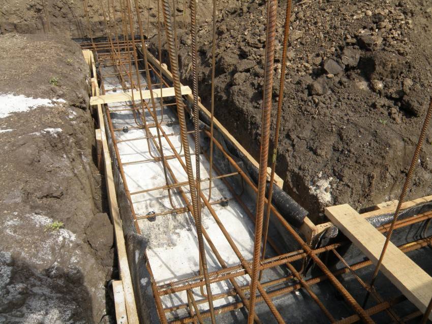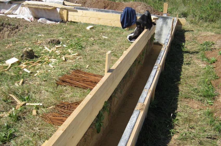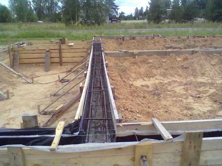 Конструкция опалубки выполняется на 3-5 см выше, чем планируется высота фундамента, так как бетонный раствор имеет свойство усадки. Она монтируется в предварительно подготовленный котлован, ширина которого на 15-20 см больше ширины опалубочной конструкции.