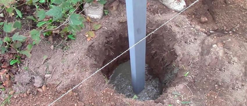 Буром ямы, если высота опоры больше 2 м, делаются примерно 80 см глубиной, внизу делается расширение, которое заливается бетоном. Стенки укрепляются рубероидной трубой, которая должна выступать на 15 см. Вокруг этой выступающей части делается деревянная опалубка. Яма не полностью заполняется бетоном. Пока раствор еще не застыл, вставляется железный прут или штырь, чья длина немного меньше, чем у самого столба.