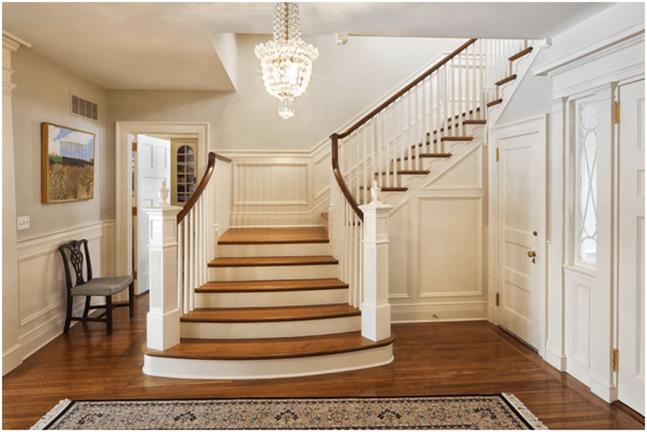 Для внутреннего убранства дома в классическом стиле отменным решением станет лестница с коваными перилами, увенчанными поручнями из натуральной древесины. Также превосходно смотрятся массивные деревянные конструкции с декоративными элементами, подчеркивающими богатство убранства.
