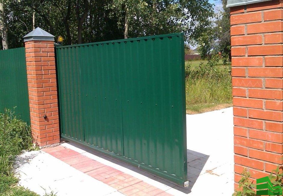 Откатные ворота из профлиста — рама, сваренная из металлической трубы, зашитая внутри профнастилом. Они устроены по принципу шкафа-купе.