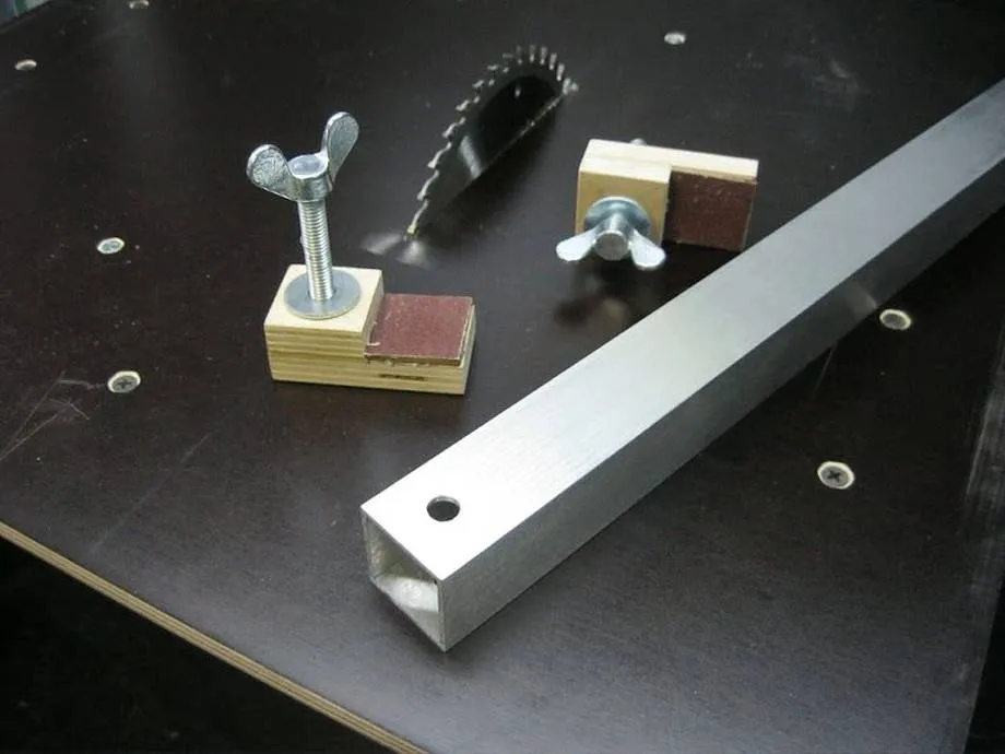 - Два куска древесины жестко закрепленных на каретке и сбоку циркулярного стола решают эту задачу, рисунок 1.