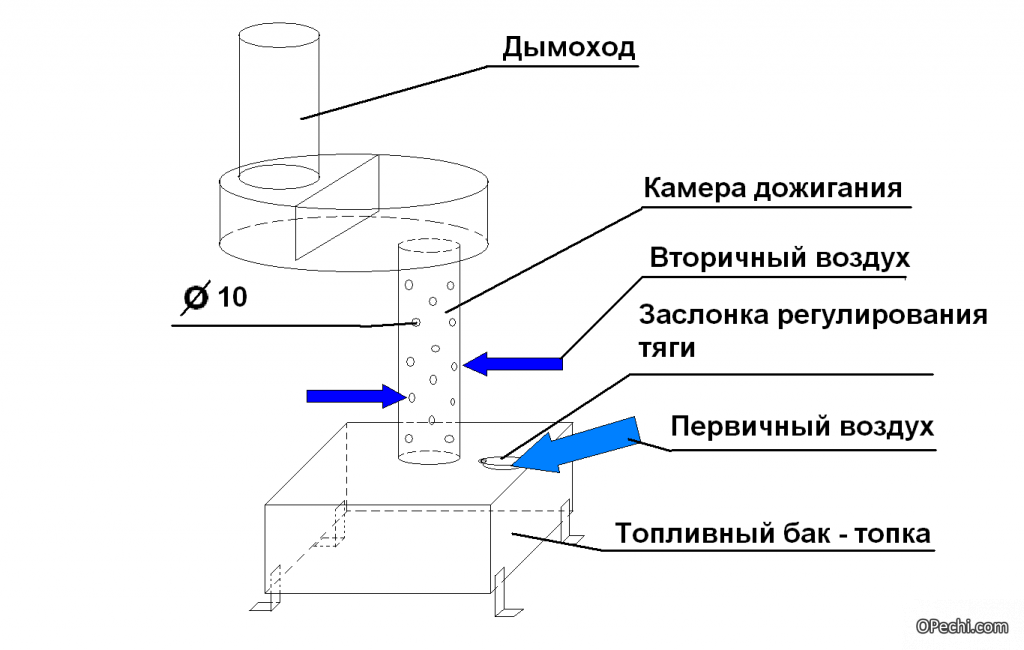 В результате сгорания основного топлива образуются пары, поступающие в следующую камеру, где они смешиваются с воздухом. После этого при очень высокой температуре происходит их горение, в результате чего обеспечивается высокая эффективность функционирования прибора.