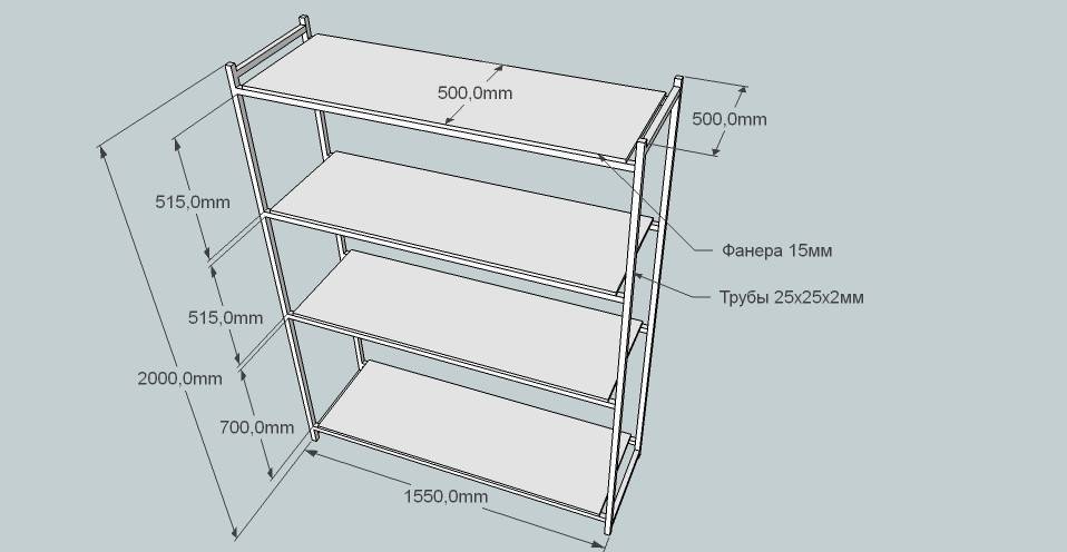 Чертежи и размеры стандартной конструкции представлены на рисунке. При определении ее габаритов (высоты и глубины полочек) учитываются параметры предметов, которые планируется на них ставить. Рассчитывать длину пролета, т.е. расстояния между односекционными стойками надо как можно точнее. На этот параметр влияет жесткость материала, используемого для изготовления ГСХ. Недопустимо прогибание полочек, какой бы сильной не была нагрузка на них.