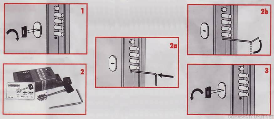 Многих владельцев интересует, как поменять код у цилиндрового механизма. Самостоятельная перекодировка замка входной двери начинается с приобретения перекодировочного набора. Если монтаж был сделан недавно, то возможно у вас имеются необходимые для операции вещи в старом наборе. Там обязательно должен быть монтажный ключ, элемент для перекодировки и новые ключи. Этапы: