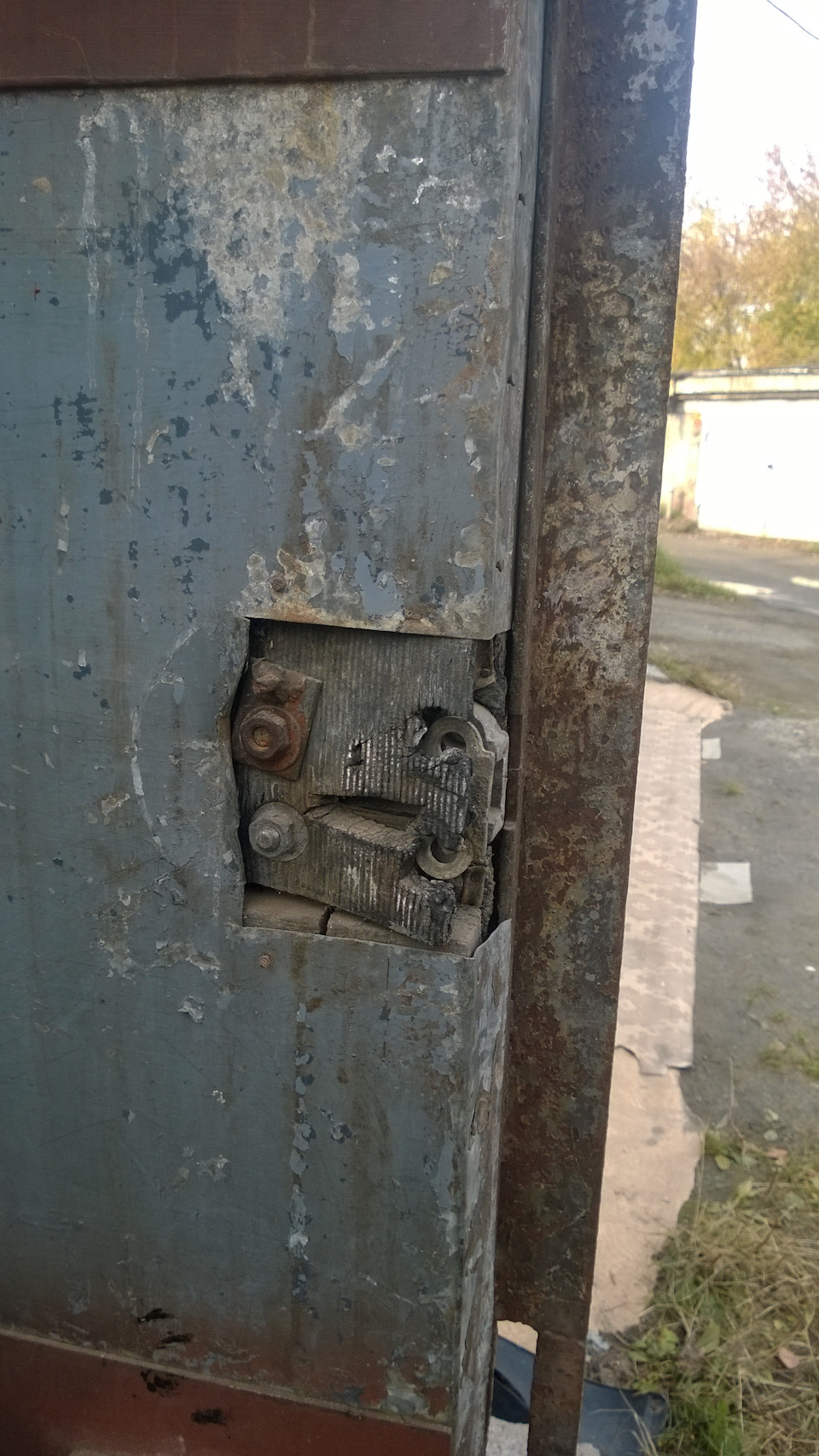 Полный размервот такой кошмар нас встречал пару раз И в гараж не зайти, т.к. калитки нет. Да и в целом ворота 80-х годов из фольги с деревянным внутренним наполнением и смешным замком.