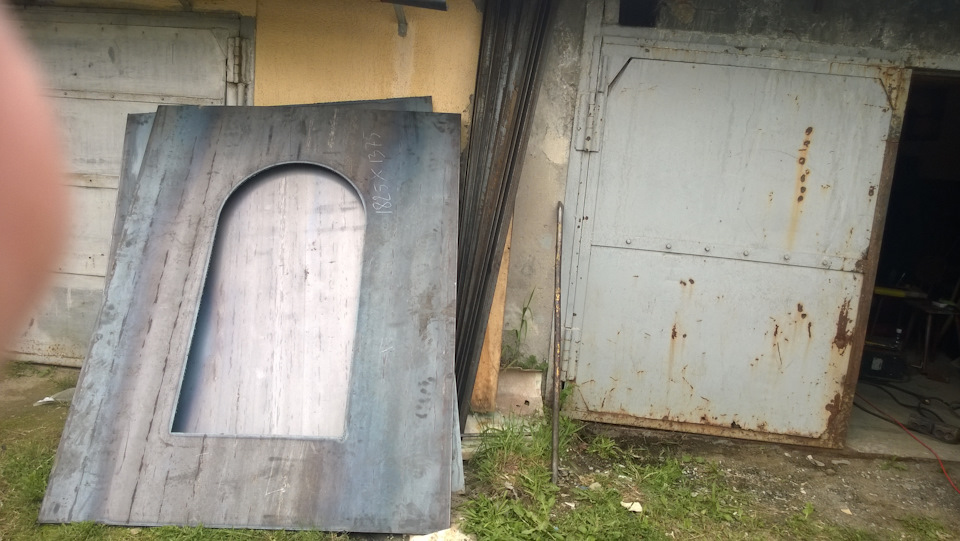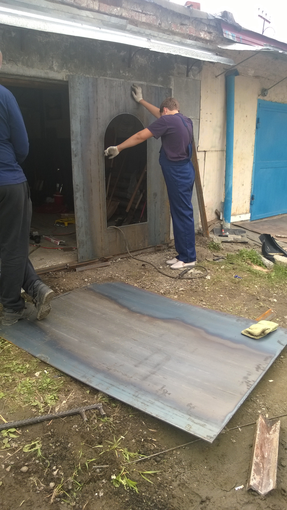Полный размерПока ставили левую воротину и перекусили тут же сделанными шашлыками авто своим весом давил на калитку. Где-то 2 часа Однако не помогло. Металл толстый и статической нагрузке не поддался. Помогали и кувалдой, и прыгали качая машину…бестолку.Ну ладно, есть оказывается и вальцы в цехе. Грузим в ситр дверцу (вес ее кстати также огромный) и полетели раскатывать.