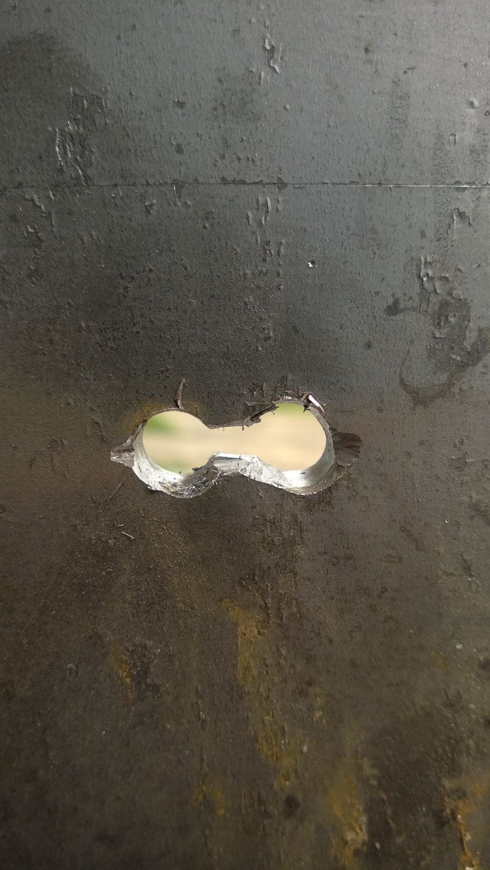 Полный размерпять прогонов на вальцах и дверка встала в плоскость Все отлично, все получилось! навесили калитку приварив петли. Изнутри из полосы стали наварили упорную планку-нащельник вокруг отверстия калитки.Изнутри на воротины наварили уголок по контуру, хотя и без него 8 мм лист никуда не гнется, но на уголок проще будет утеплитель в дальнейшем крепить. Кроме того наварили противосъемные уголки и штыри изнутри в районе петель.Теперь дело за установкой замков.Было решено ставить два замка. Первый — знаменитый челябинский Риф-1м, а второй самодельной конструкции с падающим ключом. Замки установлены как положено, на дистанционные уголки, на каленые болты на которые накручены колпачковые нержавеющие гайки от высверливания, между замками и дверкой размещены напильники. Извиняйте, фото не прикладываю Мучили меня сомнения, как же сделать для ключа Рифа замочную скважину, которая в форме гантели. Деваться некуда, надо сверлить. Долго, очень долго и нудно на малых оборотах сверлом с оксидом титана высверлил два отверстия, теперь нужно между ними прорезать щель для ключа на глубину 8мм металла. Хорошо взял из дома дремель, хотя и без особой надежды.
