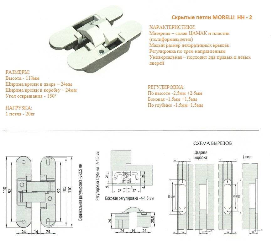 Скрытые петли Morelli так же являются достаточно качественными и надёжными, хотя и имеют свои недостатки. В частности они имеют строгое ограничение по весу в 40 кг. Это значит, что подойдут петли данного брэнда только для установки на лёгкие межкомнатные двери.