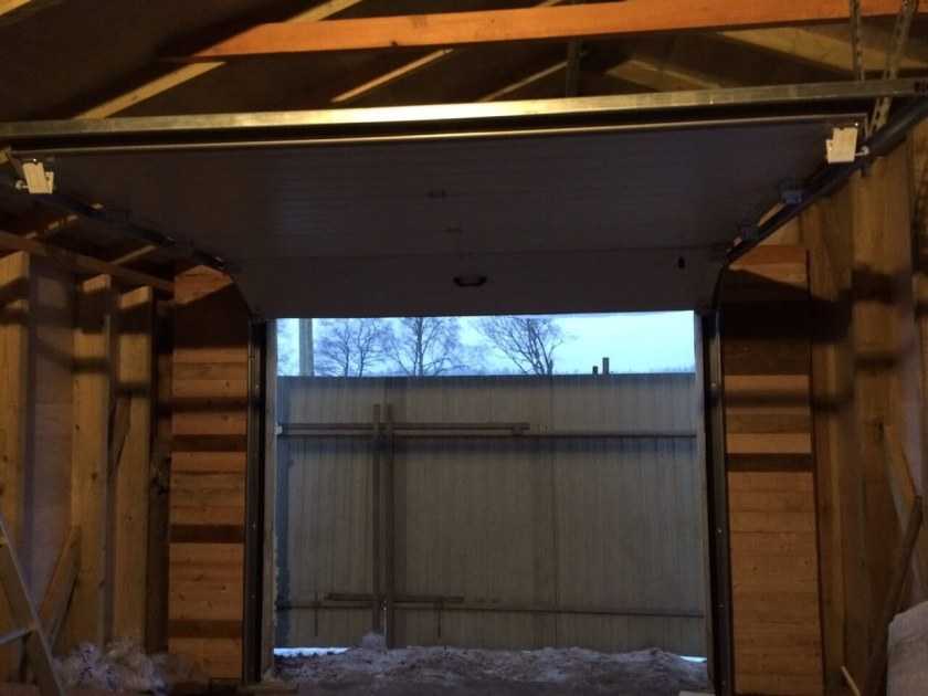 Во время того, как будут открывать ворота гараж, размеры которых могут быть самыми разными, ставни будут поворачиваться и приподниматься кверху, под самый потолок помещения. В этом месте и будут размещены подъемные механизмы, для которых следует предусматривать место для монтажных работ