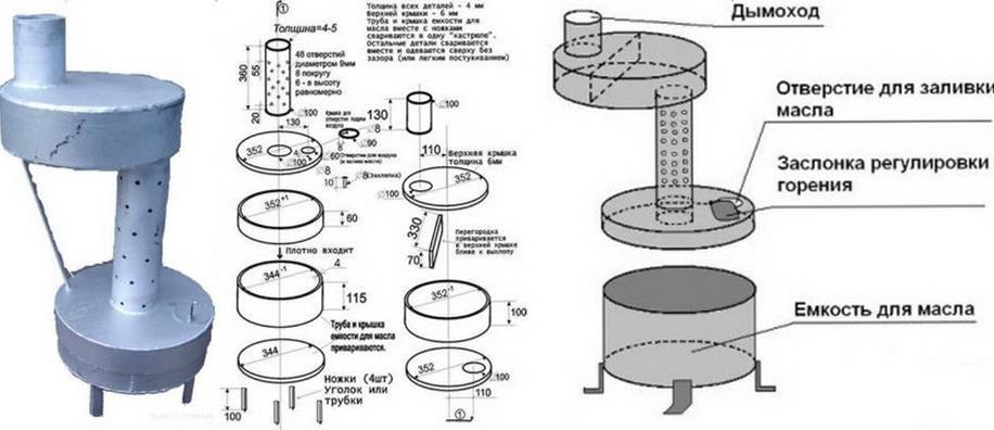 Некоторые используют схемы, позволяющие самостоятельно сделать конструкцию, работающую на отработанном масле. Такие модели печей устанавливают, когда не хватает угля с дровами.